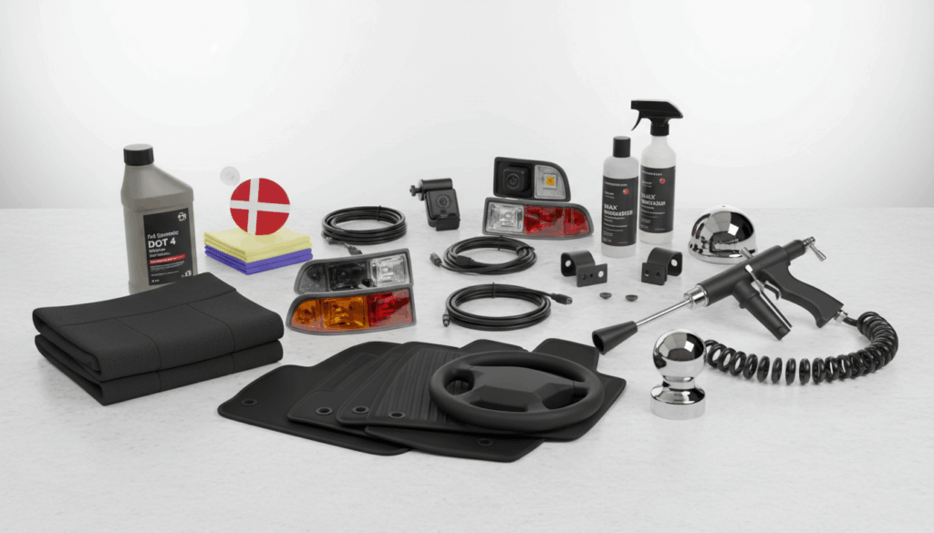 Bildele og tilbehør dækker alt, der holder bilen eller køretøjet sikkert og funktionelt. Her finder du udvendig belysning og signaludstyr som markeringslys og pærer, samt bakkameraer og kameraer indbygget i bremselygter, der giver bedre udsyn og øget sikkerhed i trafikken. Det omfatter også kabler, monteringsdele og tilbehør til dashcam og stereo, så installationen bliver nem og pålidelig.