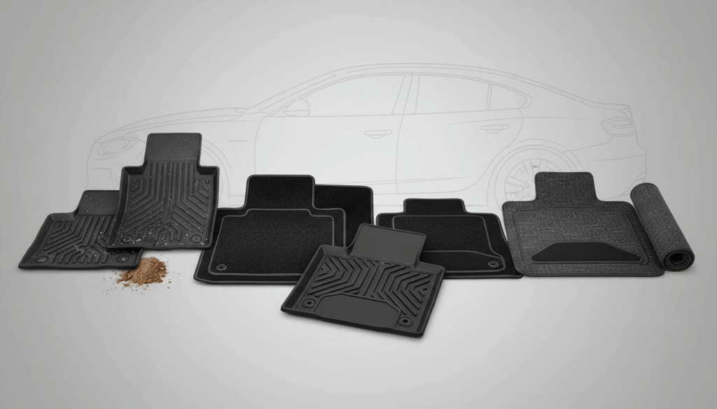 Materialerne spænder fra slidstærkt gummi til blødere tæppe- eller velour-måtter. Gummimåtter er særligt velegnede til vinter og regnvejr med høj kant, der holder snavs ude, mens tæppe-måtter giver et mere luksuriøst look og komfort. Ved købet bør du overveje bilmodel og år, kantens højde, anti-slip egenskaber og hvor let måtten er at rengøre. Nogle sæt fås som komplette bilsæt, andre som modulbaserede løsninger.