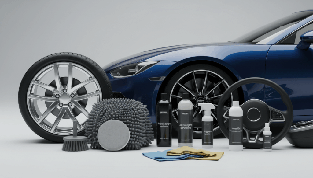 Der er variationer, som syrefri fælgrens, glasrens, gummifornyer og tilbehør som mikrofiberklude, polerpuder og applikatorer. Når du vælger, er det vigtigt at tænke på overfladekompatibilitet, ønsket finish (blank, mat eller vådglans), holdbarhed og brugervenlighed.