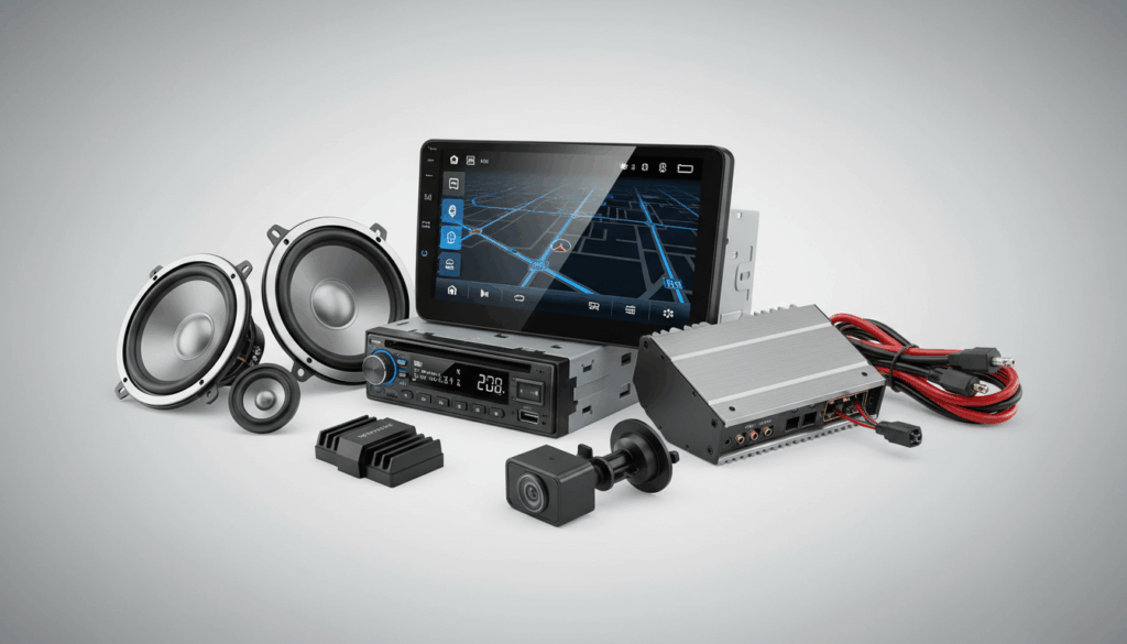 Ud over selve enhederne findes højttalere (coaxial og komponent), forstærkere, DSP’er og monteringsdele. Der er kabelsæt og sikringer, der gør installationen sikker og holdbar. Tilbehør som bakkameraer og dashcams giver ekstra sikkerhed og praktiske funktioner i hverdagen.