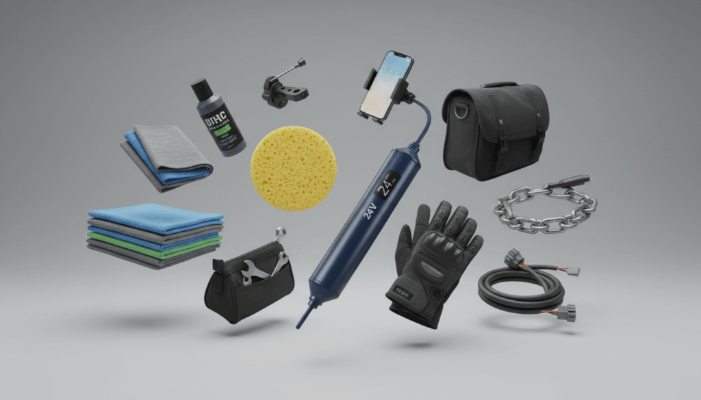 Ekstraudstyr og tilbehør dækker produkter, der supplerer motorcyklen uden at være selve køretøjet. Her finder du pleje og rengøring som mikrofiberklude, svampe og poleringsmidler, opbevaring og transport som tasker og monteringsbeslag samt praktisk strøm- og varmeudstyr som vandvarmere og ledningssæt. Derudover findes monteringstilbehør og beskyttelses- og sikkerhedsudstyr til installation og brug i hverdagen, på lange ture eller i værkstedet. Udvalget spænder fra små, håndholdte plejeprodukter til større installationer og opbevaringsløsninger, alle med fokus på funktionalitet og lang levetid.