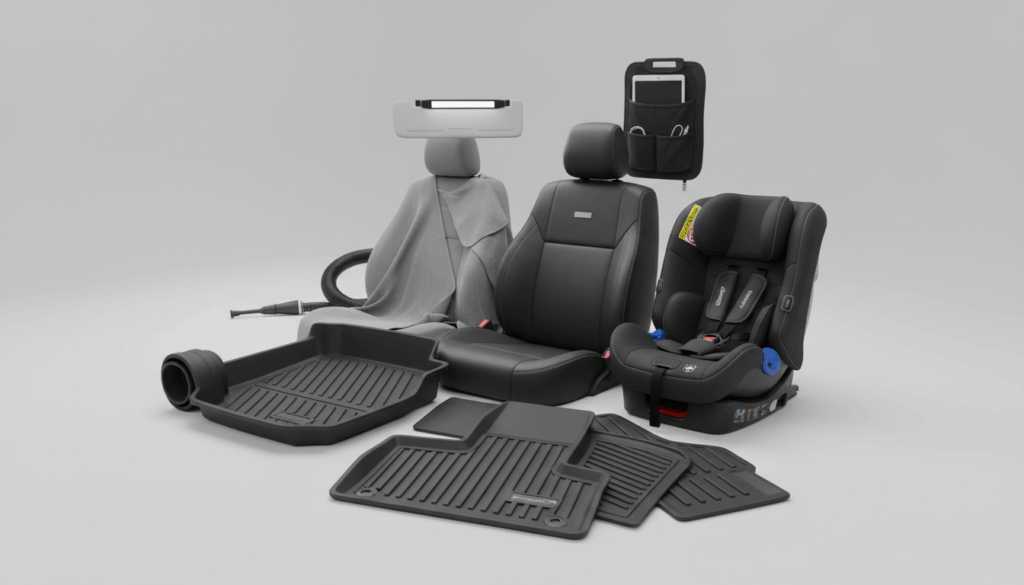 Indvendigt tilbehør dækker alt, der gør bilens kabine mere funktionel og behagelig. I denne kategori finder du sædeovertræk, måtter og bagagerumsbakker, interiørlys, solskærme og smart opbevaring samt autostole. Produkterne fås i bomuld, stof, syntetisk læder og Nappa og kommer som universelle modeller eller skræddersyede løsninger til specifikke bilmodeller, hvilket giver 100% pasform og nem montering via kroge eller kliksystemer.