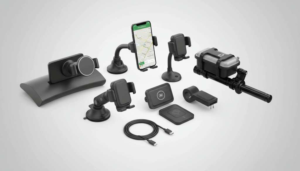 Til bilen findes sugekopholdere til forruden eller instrumentbrættet samt luftventilmontering, der hurtigt klikkes på. Magnetiske holdere giver hurtig, sikker montering, mens løsninger med 3-i-1 eller integreret trådløs opladning kombinerer opladning og opbevaring. Der findes også løsninger til motorcykel og crossbar.