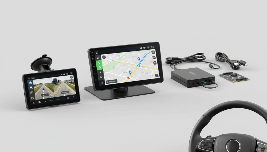 Typiske produkter spænder fra robuste 7- til 9-tommers skærme med rutevejledning, Bluetooth og CarPlay/Android Auto til integrerede systemer, der tilføjer eller forbedrer navigation, kortopdateringer og camperfunktioner i særlige modeller.