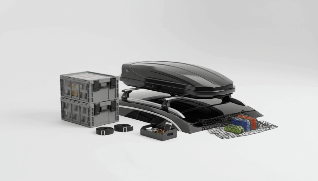 Typiske produkter inkluderer bagageremme til fastgørelse af bagage eller cykler, centerboxe til bilens bagagerum, robuste opbevaringsbokse til værktøj og småting, net og tagbokse til ekstra plads.