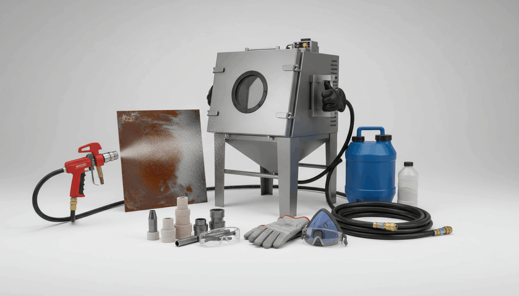 Typiske anvendelser omfatter fjernelse af maling og rust samt forberedelse af overflader til behandling i metal, træ og murværk. Der findes tør sandblæsning og vådsandblæsning, dyser i forskellige åbninger og regulerbart tryk, så du kan styre stråleegenskaben og forbruget.