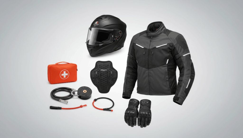 Denne kategori samler alt sikkerhedsudstyr til motorcyklen: førstehjælpskit, tyverisikring og beskyttelsesudstyr som hjelme, jakker, handsker og rygbeskytter.