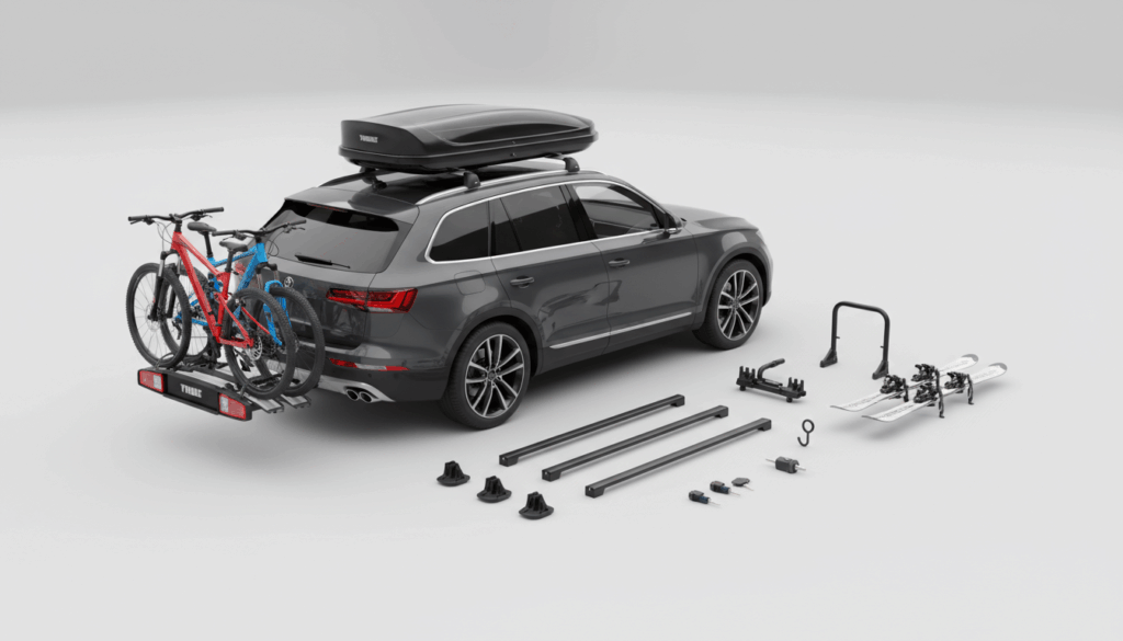 Variationerne spænder fra 1- til 3-cykelholdere som Velocompact og Outride samt 3000-seriens Rapid Fixpoint-sæt til nem, sikker montering af ski, cykler og kajakker. Der findes adapters og tilbehør, der sikrer kompatibilitet med forskellige køretøjer og Thule-systemer. Fokus ligger på sikkerhed, stabilitet og holdbarhed under transport.