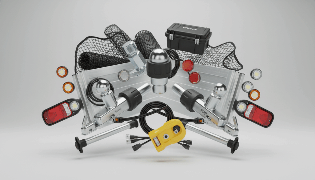Trailer tilbehør samler alt, der gør din trailer nem og tryggere at bruge i hverdagen. Her finder du kuglekoblinger i varianter som EM 80R-F, EM 80V-F og SPP, lygtesæt og markeringslygter, der opfylder ECE-krav, trailernet til beskyttelse af lasten samt ekstrasider og støttedeben, der øger kapacitet og stabilitet. Til opbevaring og sikkerhed findes låse og praktiske løsninger som Towbox.