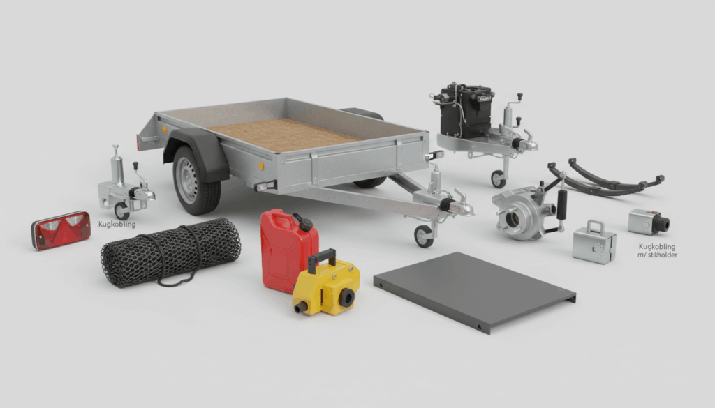 Trailere og tilbehør samler alt udstyr til transport, opbevaring og sikkerhed omkring trailere. Denne kategori omfatter både forskellige trailertyper og et bredt udvalg af tilbehør: kuglekoblinger i forskellige størrelser, lygtesæt og markeringslygter, trailernet og beskyttelsesløsninger som låse og låsebokse, ekstrasider og sidepaneler til Brenderup og andre mærker, samt bremsekomponenter, støddæmpere og ophæng.